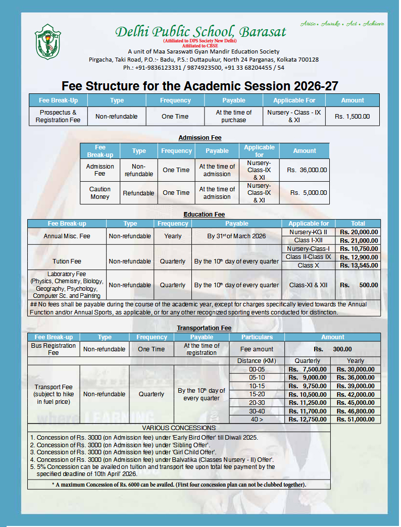 You can check out all the details pertaining to the school in the prospectus and the registration forms are given below. Moreover, the DPS Barasat fees structure is also available to you. Furthermore, you can check out the following other details over here: