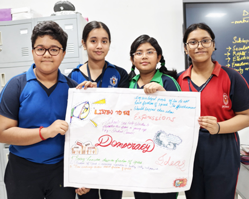 | Democracy on Display : Activity on Educational boards | Students were divided into 5 groups. Each having a leader of the group. They made educational boards on the topics:a. Secularism, b. Rights, c. Election, d. Freedom of speech, e. Unity of Sense of brother hood |