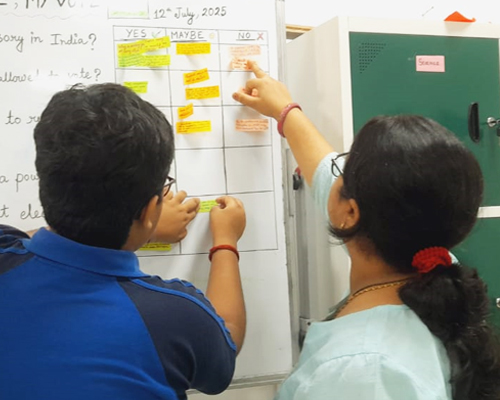 | My Voice My Vote. Activity: a. Poll Wall Activity b. Open Mic Reflection. c Rapid fire Quiz. d Reflection and pledge wall | After giving a brief introduction Poll wall activity was conducted . In this activity a chart was set up using two coloumns Agree and Disagree. Students used sticky notes to stick their views on Questions on " My voice, My Vote". Then 4-5 students were invited to share their views on questions asked for two minutes. It was followed by a rapid fire quiz where students participated actively. It ended with students writing a pledge with" I pledge to be a responsible citizen because.... " |